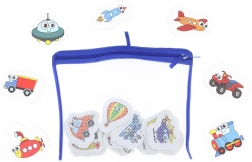 Aufkleber mit Motiven von Autos, Zügen oder Schiffen verwandeln jedes Bad in ein fröhliches Spiel. Einfach anfeuchten und auf Badewanne, Fliesen oder andere nicht saugende Oberflächen drücken – sie halten, lassen sich aber dennoch leicht abnehmen und versetzen. Durch die leuchtenden Farben und unterschiedlichen Formen trainieren Kinder beim Spielen die Hand-Auge-Koordination und lernen verschiedene Verkehrsmittel kennen.