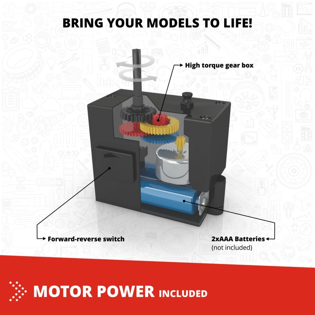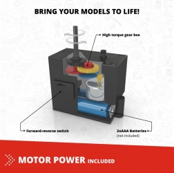 Enthalten ist ein Motor mit einstellbarer Fahrtrichtung. Erwecken Sie Ihre Modelle zum Leben und lassen Sie sie fahren oder rollen.