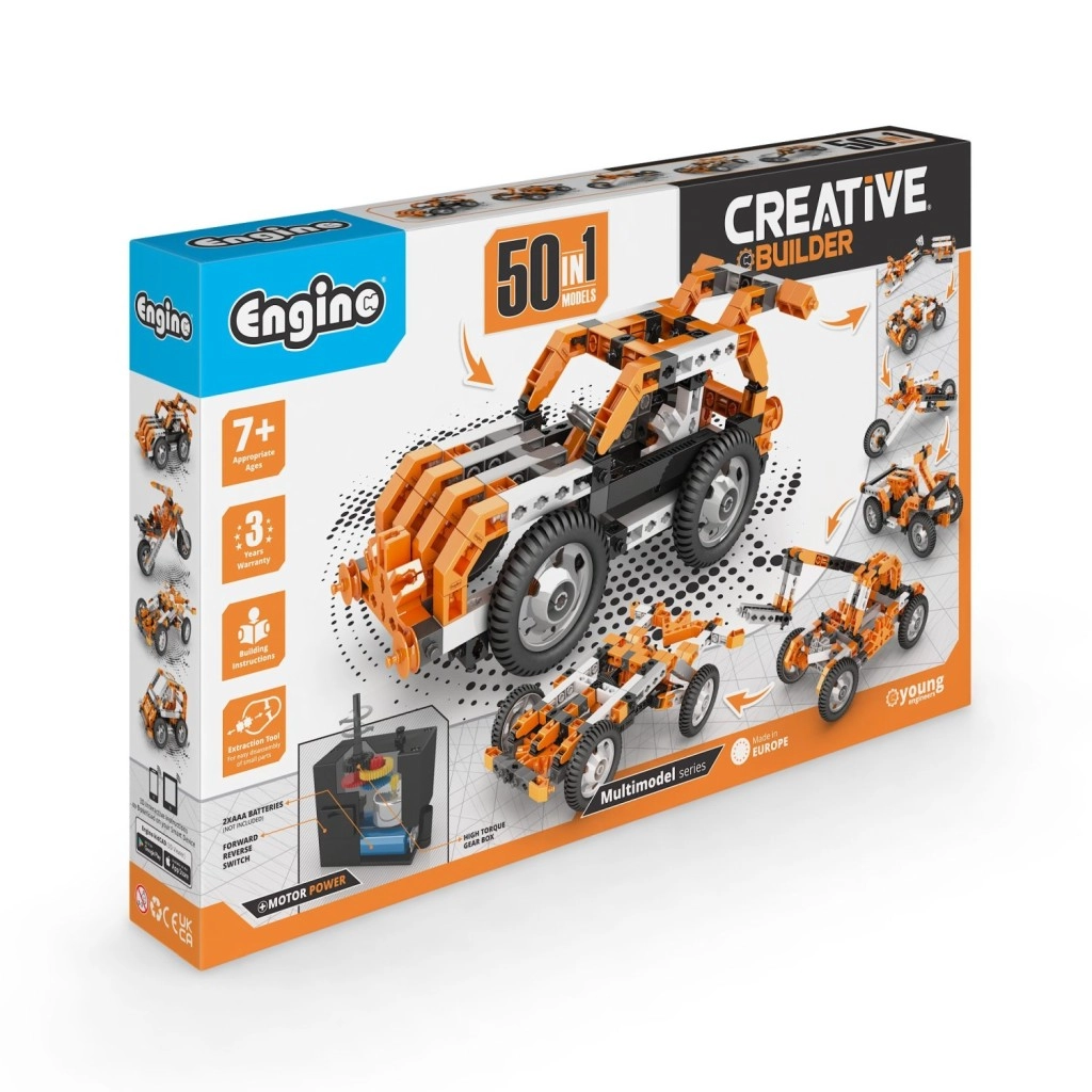Fördern Sie Kreativität und technische Fähigkeiten Ihrer Kinder mit dem ENGINO Creative Builder 50 in 1. Aus einem Set bauen Sie bis zu 50 Modelle – von Autos über Flugzeuge bis hin zu robotischen Formen – und mit dem Getriebemotor bringen Sie Ihre Konstruktionen in Bewegung. Das Bauen gelingt leicht mit der interaktiven 3D-App kidCAD, die jeden Schritt zeigt. Geeignet ab 7 Jahren, kompatibel mit anderen ENGINO-Bausätzen.