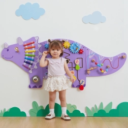 Die farbenfrohe hölzerne Wandtafel in Form eines Triceratops von VIGA TOYS bietet zahlreiche Aktivitäten zur Förderung von Kindern. Darauf finden Sie ein Xylophon mit Schlägel und eine Klingel/Gong, drehbare Zahnräder, ein Labyrinth mit 5 aufklappbaren Eiern (Spiegel + kleine Dinosaurier), sich verändernde Augen per Knopf sowie eine packende Perlenbahn mit Perlenabschuss. Ideal zur Förderung von Feinmotorik, Augen-Hand-Koordination und sensorischer Entdeckung.
