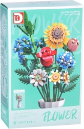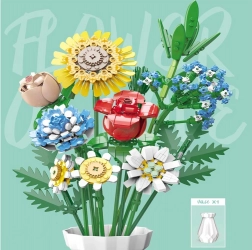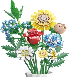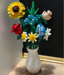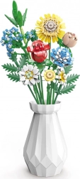 Verwandeln Sie den Bausatz in eine Design-Dekoration. Der farbenfrohe Strauß aus Bauteilen umfasst Sonnenblume, Rosen, Nelke, Gänseblümchen, Lilie, Vergissmeinnicht und grüne Ergänzungen (Haitong-Blätter, Zeder, Gras). Ebenfalls enthalten ist ein eleganter cremefarbener Flakon, sodass Sie den fertigen Strauß sofort auf ein Regal oder einen Tisch stellen können.