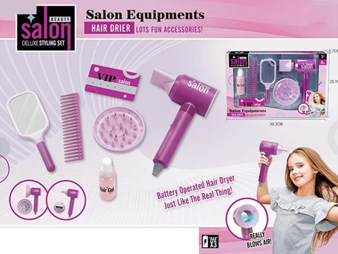 Interaktives Friseursalon-Set mit austauschbaren Aufsätzen und batteriebetriebenem Fön, ideal für Kinder ab 3 Jahren, bringt Spielspaß und fördert die Kreativität.
