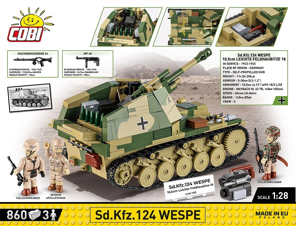 Sd.Kfz. 124 Wespe Bausteinset ist die ideale Wahl für Fans historischer Sets aus der COBI‑Schmiede. Dieses Set erweitert die Reihe der Fahrzeuge auf dem Fahrgestell des Panzers II und stellt die Selbstfahrlafette Wespe vor. Dieses Modell in der Executive Edition besteht aus 855 Teilen und ist im Modellmaßstab 1:28 gestaltet.