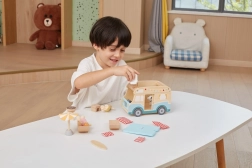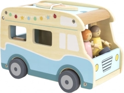 Der Campingwagen ist aus hochwertigem Holz gefertigt, was Langlebigkeit und Sicherheit für Kinder garantiert.