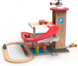 Diese hochwertige Holzgarage mit Eisenbahnschiene bietet drei Parkebenen, einen funktionsfähigen Aufzug mit Kurbelantrieb und einen Landeplatz auf dem Dach. Kinder können unten an den Säulen tanken, das Auto mit dem Aufzug nach oben befördern und es die rote Spiralrampe wieder hinunterrollen lassen, wo es nahtlos auf die Schienen übergeht. Robuste Materialien und durchdachte Details sorgen für Langlebigkeit und sicheres Spielen.