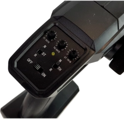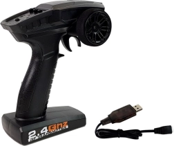 Der ergonomische Sender ermöglicht fein dosierbares Gas und präzises Lenken. Die 2,4-GHz-Frequenz verhindert Störungen, und die Reichweite von bis zu 80 m bietet viel Bewegungsfreiheit. Stromversorgung: 3× AA (nicht enthalten).