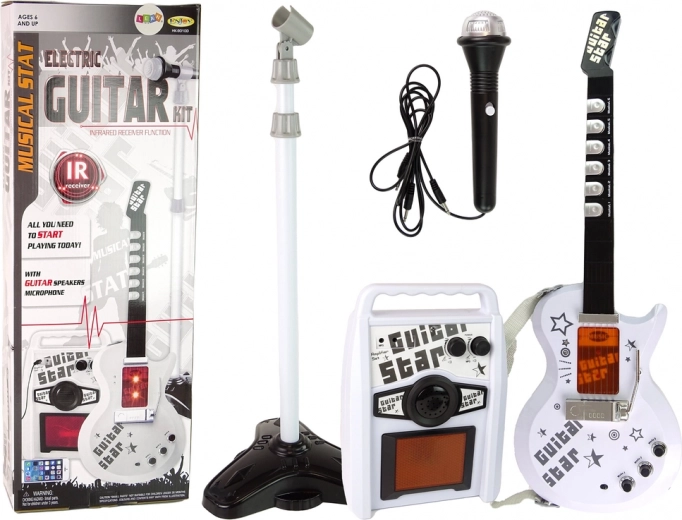 Diese Elektrogitarre mit Mikrofon ist ein großartiges Spielzeug für die Kleinsten und zieht sie in die zauberhafte Welt der Musik. Die Gitarre in weißer Ausführung sieht sehr realistisch aus und begeistert jedes Kind. Sie wird mit drei Batterien betrieben, was unbeschwerten Spielspaß ermöglicht, und leuchtet nach dem Einschalten, was die Attraktivität erhöht und die kindliche Fantasie anregt.