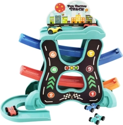 Diese farbenfrohe Rennbahn mit Autos ist das ideale Spielzeug zur Förderung der Motorik und der Fantasie. Kinder beobachten, wie die Autos über drei Ebenen hinabsausen, und trainieren dabei Farbwahrnehmung, Ursache und Wirkung sowie Geduld. Die robuste Konstruktion eignet sich für den täglichen Einsatz.