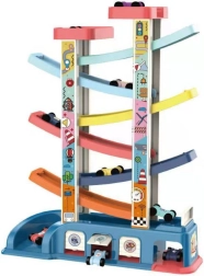 Diese Rutschbahn-Rennstrecke verwandelt jedes Auto in einen kleinen Flitzer. Kinder setzen die Autos auf die obere Rampe und beobachten, wie sie über die einzelnen Ebenen nach unten sausen. Die pastellfarbene, angenehm dezente Farbgebung hält die Aufmerksamkeit, während die kompakten Maße sowohl ins Kinderzimmer als auch in die Spielecke passen.