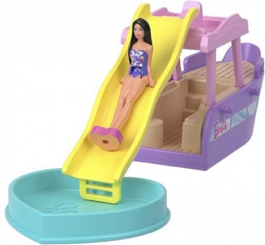 Entdecken Sie die Magie der MINI BARBIE LAND Welt mit einem bezaubernden Mini-Boot, das sich im Handumdrehen in einen spaßigen Wasserpark verwandelt. Das Set enthält ein Boot mit abnehmbarer Rutsche und einen türkisfarbenen herzförmigen Pool sowie eine Mini-Puppe. Ideal zum Reisen, Sammeln und für kreatives Spielen. Kompakte Maße, durchdachte Details und eine funktionale Rutsche sorgen für jede Menge fantasievollen Spielspaß.