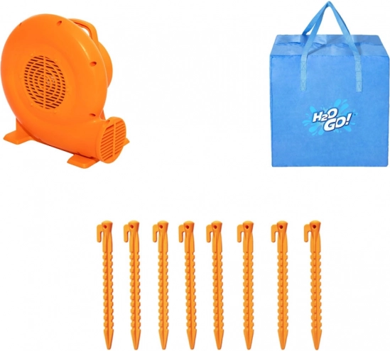 Ein leistungsstarkes Gebläse mit 220–240 V ist enthalten. Einfach ausbreiten, einschalten und der Wasserpark ist nahezu sofort einsatzbereit.