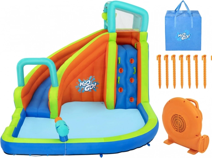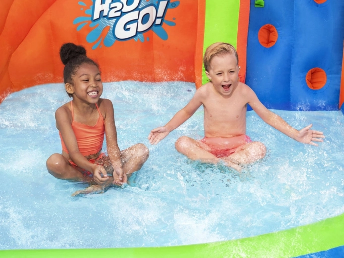 Der Bestway H2O GO! Wasserpark ist eine All-in-one-Attraktion für aktiven Wasserspaß im Garten. Die robuste Rutsche mit oberer Plattform, die durch ein Netz gesichert ist, führt in einen geräumigen Pool, während ein integrierter Sprühnebel und ein überraschender kippbarer Wasserkübel Rutsche und Kinder angenehm nass halten. Dank des Schnellaufblasens mit dem leistungsstarken Gebläse ist der Park in weniger als 2 Minuten einsatzbereit.