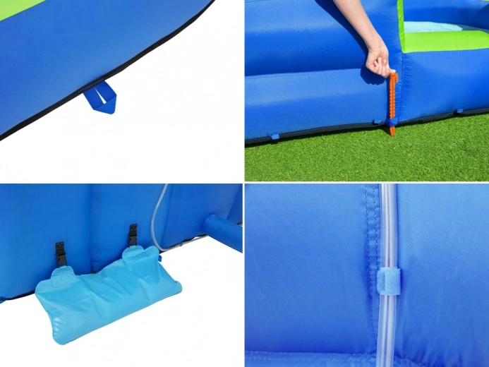 Das langlebige Material aus Polyester mit PVC-Beschichtung und die durchdachte Verankerung sorgen für Stabilität. Im Lieferumfang ist alles enthalten: Gebläse, Heringe, Sprühschlauch und eine praktische Tragetasche. Ideal für Familienfeiern, Wochenenden und täglichen Wasserspaß unter Aufsicht von Erwachsenen.