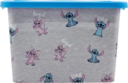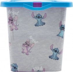 Die Aufbewahrungsbox ist mit fröhlichen Motiven der Figuren Stitch und Angel verziert und wird so zu einem unterhaltsamen Hingucker in jedem Zimmer.