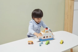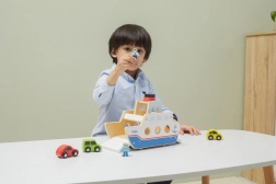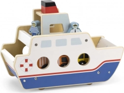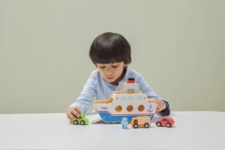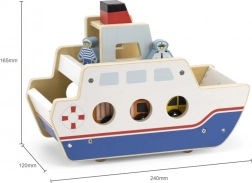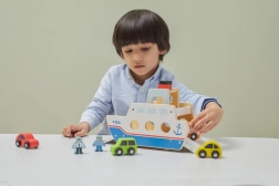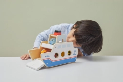 Entdecken Sie ein unterhaltsames Holzschiff auf Rollen, das als Fähre für kleine Autos dient. Dank der klappbaren Rampen auf beiden Seiten genießen Kinder realistisches Spielen und trainieren die Feinmotorik. Enthalten sind 4 Holzautos mit Freilauf und 2 Figuren, die kreatives und fantasievolles Spiel fördern.