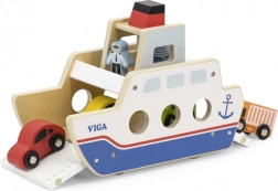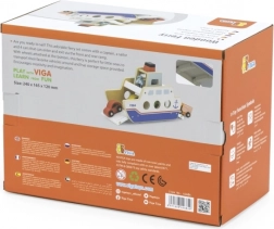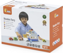 Dieses hochwertige Holz-Fährschiff erfreut alle kleinen Liebhaber von Fahrzeugen und Schiffen. Das Schiff fährt auf Rollen und lässt sich leicht bewegen. Es besitzt klappbare Rampen auf beiden Seiten, damit die Autos bequem auf- und abfahren können. Die robuste Verarbeitung und glatten Kanten sind ideal für Kinder ab 18 Monaten.