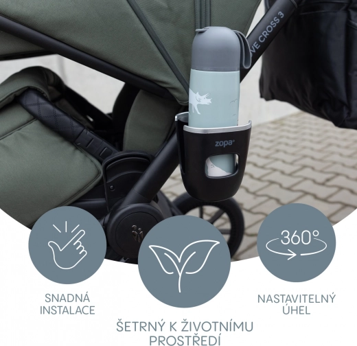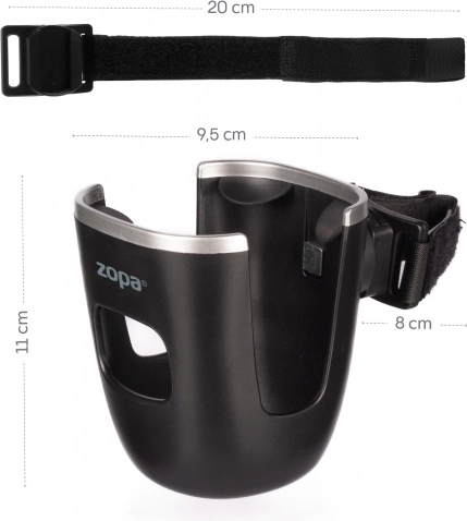 Der Becherhalter der Marke Zopa lässt sich einfach mit einem verstellbaren Band am Kinderwagen befestigen. Sein modernes Design mit glänzendem Metallrand ist ein idealer Begleiter für den täglichen Gebrauch. Der praktische schwarze Kunststoffhalter ist dafür ausgelegt, Flaschen oder Becher auf Reisen sicher zu befestigen.