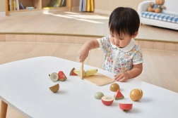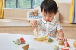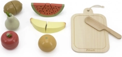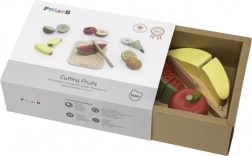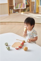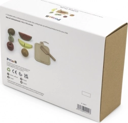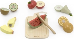 Mit diesem Set aus Holzobst können Kinder stundenlang spielen und gleichzeitig lernen. Mit dem Holzmesser können sie sicher schneiden und Obst nach ihrer Fantasie kombinieren.
