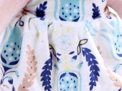 Diese Puppe ist vollständig aus weichem, angenehm anzufassendem Material hergestellt. Sie trägt ein plissiertes Kleid mit Blumenmuster, das farblich auf Schuhe, Kragen und Hut abgestimmt ist. Ihr Haar ist lockig und blond. Augen, Augenbrauen, Lächeln und Nase sind gestickt, was sie komplett frei von kleinen Teilen macht, die beim Spielen abfallen könnten.