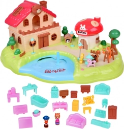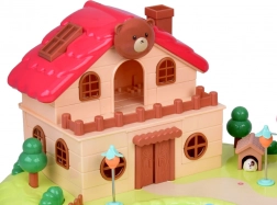 Das mehrstöckige Innere ist reich ausgestattet: Im Erdgeschoss finden Sie ein Schlafzimmer mit bequemem Bett und aufklappbarem Kleiderschrank, zudem fehlen Sofa, TV und Kommode nicht; im Obergeschoss gibt es ein Badezimmer mit Badewanne, Waschbecken und Waschmaschine; die nächste Ebene bietet eine Küche mit Kühlschrank sowie ein Zimmer mit Schminktisch. Im Garten warten Karussell und Schaukel für noch mehr Spaß.