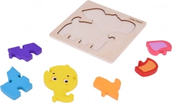 Sechs größere Teile und eine Holzplatte mit Elefantensilhouette erleichtern das richtige Einsetzen und stärken das Selbstvertrauen des Kindes beim Spielen.