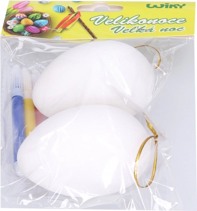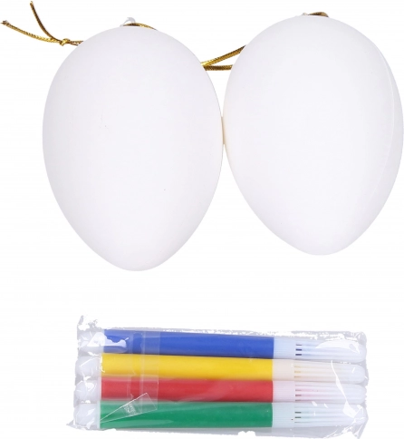 Kreativset für Kinder und Erwachsene: Zwei Kunststoff-Eier zum Ausmalen in der Größe 5 × 8 cm ergänzt durch 4 farbige Stifte. Ideal für Osterdekorationen, Bastelarbeiten und die Förderung der Fantasie.