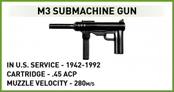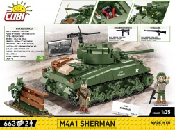 Der Bausatz bietet funktionale Elemente: Kettenfahrwerk, drehbaren Turm, bewegliches Rohr, öffnende Kommandantenluke und Serviceabdeckung mit Motornachbildung. Im Set enthalten sind zwei Minifiguren – ein US-Panzerfahrer mit Kehlkopffon und M3 „Grease Gun“ sowie ein Infanterist mit M1 Garand – plus Umgebungszubehör, darunter ein Zaunabschnitt und eine Hecke.
