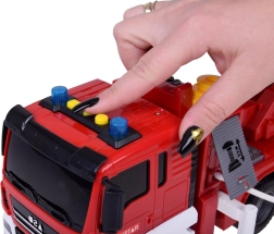 Dieses detailreich gestaltete Feuerwehrfahrzeug begeistert kleine Heldinnen und Helden mit realistischen Funktionen – von der echten Wasserpumpe mit Schlauch über leuchtende Blaulichter und Sirene bis zur manuell auszieh- und positionierbaren Leiter. Dank Rückziehantrieb fährt das Auto ohne Batterien los, Licht und Sound werden durch die beiliegenden Batterien betrieben.