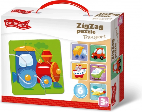 Far Far Land Puzzle ZigZag bietet ein unterhaltsames Verkehrs-Motiv mit sechs wunderschön farbigen Bildern. Spezielles gezacktes Schneiden sorgt dafür, dass das Spiel noch unterhaltsamer wird und die kindliche Logik sowie motorische Fähigkeiten entwickelt.