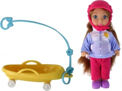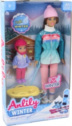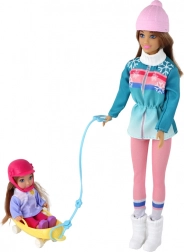 Entdecke den Zauber des Winters mit Mama und Tochter auf dem Schlitten. Die große Puppe hat lange braune Haare und eine warme Mütze, die kleine Puppe trägt einen rosa Helm für mehr Sicherheit beim Spielen. Pastellfarbene Winteroutfits mit Schneeflocken unterstreichen die Atmosphäre verschneiter Abenteuer, und der gelbe Schlitten lädt zu endlosen Fahrten ein.
