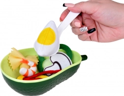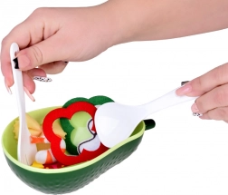 Die Schüssel ist in Avocadoform mit realistischen Details gestaltet, die Kinder zum Servieren der Plastikzutaten verwenden können. Sie unterstützt das Spielen der kleinen Köche und erweitert die kindliche Fantasiewelt.