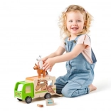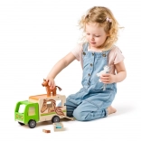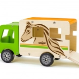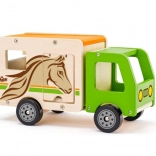 Dieser sorgfältig gefertigte Pferdetransporter aus Holz bietet Kindern realistischen Spielspaß. Die grüne Kabine, die natürliche Holzoptik und der Pferdedruck ergeben ein attraktives Design, das zu Geschichten vom Bauernhof und von der Rennbahn einlädt. Die klappbare Rampe erleichtert das Verladen der Pferde, und die robuste Konstruktion hält täglichem Spiel stand.