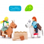 Das Set enthält zwei Figuren, zwei Pferde und eine Holzkiste mit Gemüse, sodass Kinder sofort mit eigenen Szenen beginnen können. Das Spiel fördert Fantasie, Hand-Auge-Koordination und Feinmotorik.