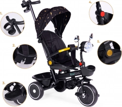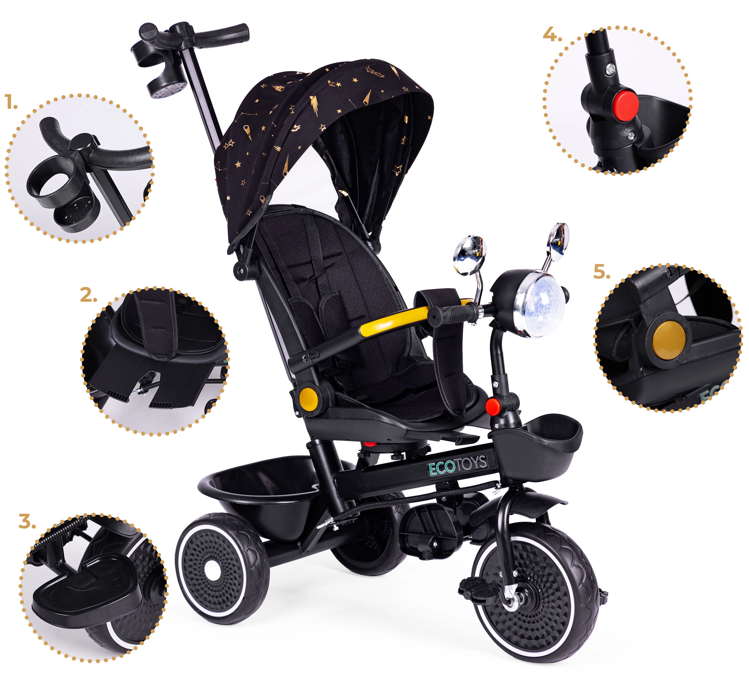 Dieses clevere Dreirad vereint Kinderwagen und Laufrad in einem. Der drehbare Sitz ermöglicht die Fahrt zur Bezugsperson oder in Fahrtrichtung, die verstellbare Rückenlehne und das klappbare Verdeck mit Belüftungsnetz schützen und erhöhen den Komfort. Die elterliche Lenkung dreht den Lenker direkt – so haben Sie Richtung und Tempo unter Kontrolle.