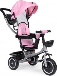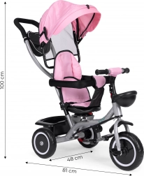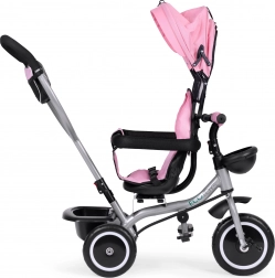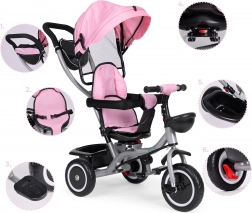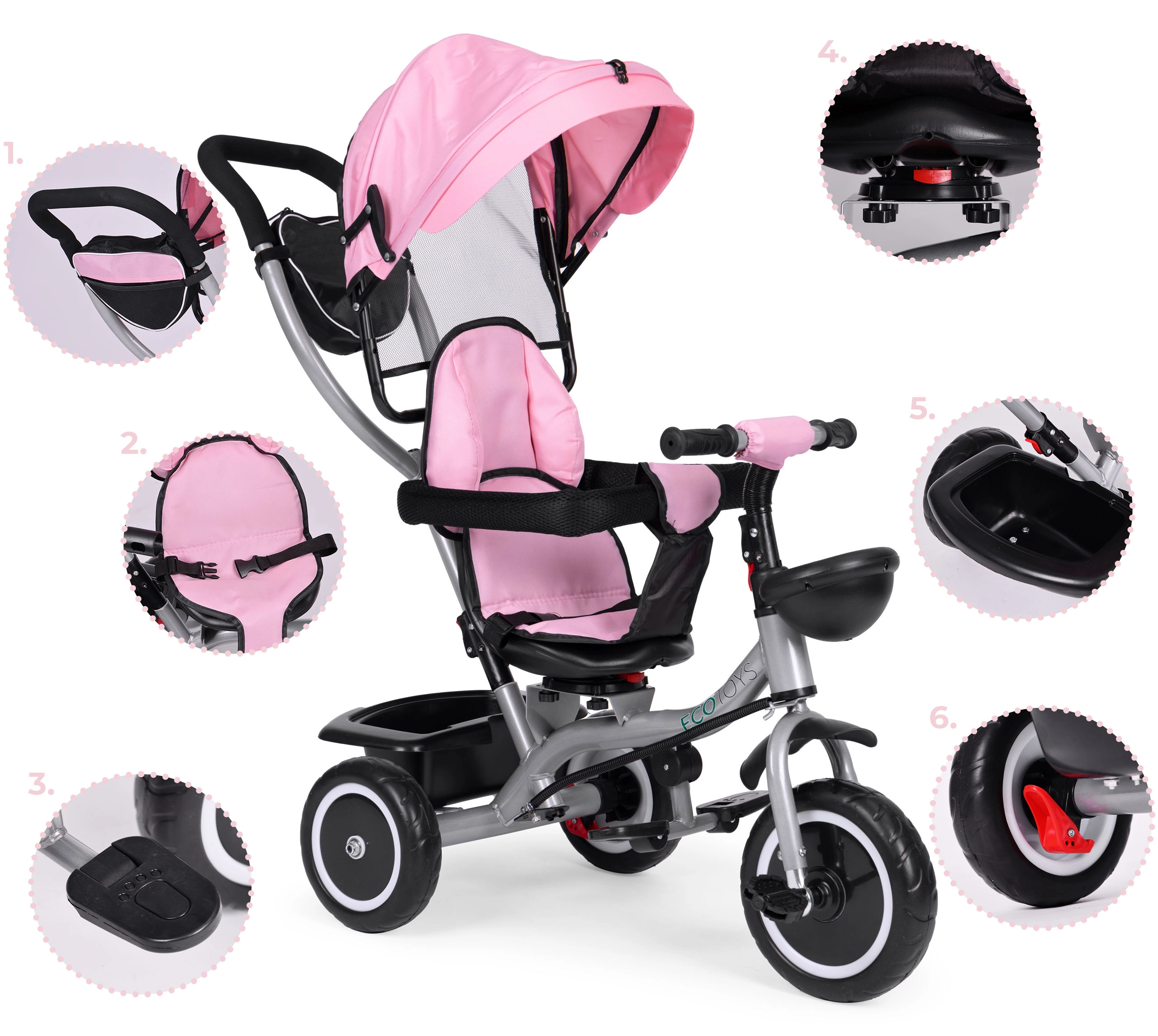 Je nach Alter lassen sich Elemente (Verdeck, Bügel, Schiebebügel) leicht abnehmen und das Dreirad an die Fähigkeiten des Kindes anpassen. Praktische Körbe und eine Tasche mit Reißverschluss bieten Platz für Spielzeug, Flasche und Kleinigkeiten für unterwegs.