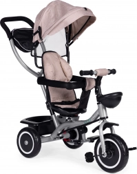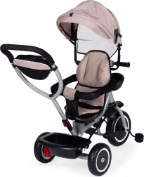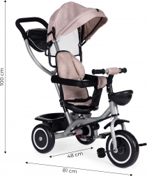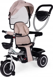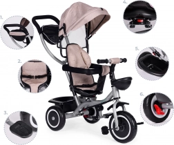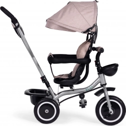 Zur praktischen Ausstattung gehören ein hinterer Korb, ein vorderes Körbchen für ein Spielzeug und eine Reißverschlusstasche für Telefon oder Schlüssel. Durch das schrittweise Abnehmen von Verdeck, Bügel und Schieber passt sich das Dreirad den wachsenden Fähigkeiten des Kindes an – bis hin zur selbstständigen Fahrt.