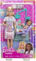 Spielen Sie Zahnarzt mit Barbie und ihrem Patienten. Das Set enthält einen weißen Kittel, Zahnwerkzeuge und einen Zahnarztstuhl.