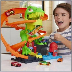 Mach dich bereit für eine spannende Fahrt in Hot Wheels City! Starte das beiliegende Metallauto 1:64 und rase am T‑Rex vorbei. Jedes Mal, wenn das Auto durchfährt, drehen sich die Augen des Dinosauriers, bis er schließlich besiegt ist. Kinder können verschiedene Szenarien ausprobieren – vom schnellen Tanken bis zum heldenhaften Sieg, der die ganze Stadt rettet.