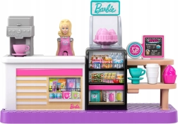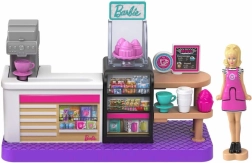 Mini Barbie-Puppe (ca. 3,5 cm), Kaffeestation mit verschiebbarem Becher, drehbare Gebäckvitrine, Tisch und Sitz, herzförmige Basis