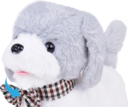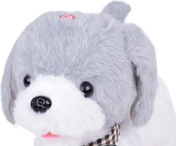 Der weiß‑graue Hund mit kariertem Schleifchen ist aus außergewöhnlich weichem Material gefertigt, das sich ideal zum Kuscheln und für das tägliche Spielen eignet.