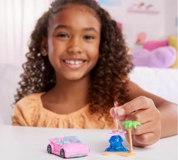 Das Auto wechselt die Farbe in kaltem und warmem Wasser, und der Effekt kann immer wiederholt werden. Die Minipuppe lässt sich an der Taille beugen, sodass sie am Steuer sitzen kann. Das Fahrzeug hat 2 Sitze, sodass Sie das Spiel leicht mit weiteren Figuren der Serie erweitern können (separat erhältlich). Die Puppe verfügt über einen Herz-förmigen Standfuß, der mit weiteren Mini Barbie Land Sets verbunden werden kann.