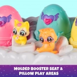 Erlebe den einzigartigen Schlüpfmoment mit dem Hatchimals Multi-Pack Wölkchen mit Neon-Regenbogen. Ziehe einfach die Schnuller aus den Eiern, fülle das Fläschchen mit Wasser und drücke es sanft in die Eier – nach wenigen Sekunden erscheinen neue Figuren: Bunnypie, Puppadee und Narwing. Außerhalb der Eier warten Kittingale und Foxstritch auf dich. Alles kannst du im Frühlingskörbchen mit integriertem Sitz und Kissen ausstellen.
