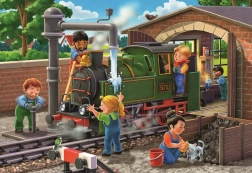 Dieses Doppelpack Kinderpuzzles vereint Lernen und Spaß in einem. Kinder genießen das Zusammensetzen zweier detailreicher Szenen: In der Werkstatt entsteht ein Modellflugzeug und im Depot wird eine Dampflokomotive gewartet. Die hochwertigen Teile von Ravensburger passen perfekt, sind robust und an kleine Kinderhände angepasst.