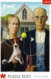 Puzzle mit dem Motiv American Gothic: Hunde-Edition bestehen aus 500 Teilen und stellen eine unterhaltsame Version des Gemäldes von Grant Wood dar. Ideal für Fans klassischer Kunst und Hundefreunde zugleich.