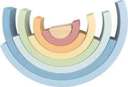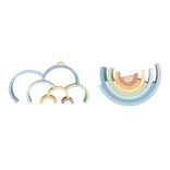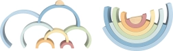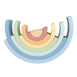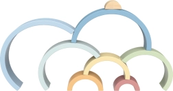 Das Set enthält 8 halbkreisförmige Teile in unterschiedlichen Größen und sanften Farben, die zu einem Regenbogen, Brücken, Tunneln und fantasievollen Bauwerken zusammengestellt werden können.