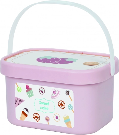 Zum Set gehört auch niedliches Geschirr – Tassen, Löffel, Gabeln und ein Messer – sowie eine stabile Kunststoffbox mit Griff für leichtes Verstauen und Transport. Pastellfarben und glatte, kinderfreundliche Teile laden zum Spielen allein oder in der Gruppe ein.