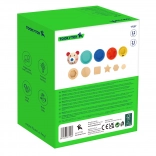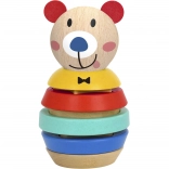 Die Holzpyramide mit Bär vereint Spiel und Lernen. Bunte Ringe, Sterne und weitere Formen werden auf die Stange und an die richtigen Positionen gesteckt, was logisches Denken und räumliche Vorstellungskraft fördert. Kinder üben spielerisch das Sortieren nach Form, Farbe und Größe.