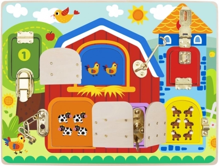 Entdecken Sie ein unterhaltsames und lehrreiches Spielzeug für Kinder ab 3 Jahren: eine hölzerne Aktivitäts-Tafel mit Bauernhof-Motiv von Tooky Toy. Sechs farbige Türchen mit unterschiedlichen Schlössern, Riegeln und Ketten fördern die Feinmotorik, das logische Denken und die Augen-Hand-Koordination, während unter den Türen Tierbilder als liebevolle Überraschung warten.