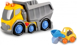 Das unterhaltsame Kiddy Go!-Set bringt einen robusten Lastwagen mit 31 cm Länge und ein kleines Auto für noch mehr Spielspaß. Das Fahrzeug bietet Licht- und Soundeffekte, die über einen Knopf auf dem Dach aktiviert werden, eine kippbare Ladefläche und Freilaufräder. 2× AA-Batterien sind im Lieferumfang enthalten. Geeignet ab 18 Monaten.