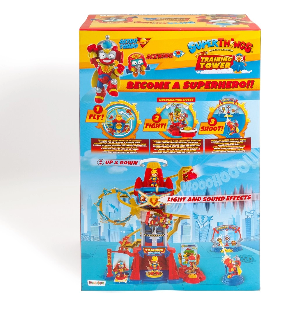 Erleben Sie aufregende Abenteuer mit dem SuperThings V - Training Tower mit Licht und Sound! Verleihen Sie Ihren Kazoom Kids Figuren die ultimative Flugerfahrung in der Kaboom City mit diesem spannenden Trainings-Turm.